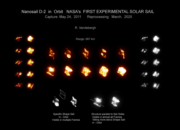 In 2011, on January 20, NASA's NanoSail-D2 unfurled a very thin and very reflective 10 square meter sail becoming the first solar sail spacecraft in low Earth orbit. Often considered the stuff of science fiction, sailing through space was suggested 400 years ago by astronomer Johannes Kepler, who had observed comet tails blown by the solar wind. But modern solar sail spacecraft designs, like NanoSail-D2, Japan's interplanetary spacecraft IKAROS, or the Planetary Society's Lightsail A, rely on the small but continuous pressure from sunlight itself for thrust. Glinting in the sunlight as it circled planet Earth, NanoSail-D2's solar sail was periodically bright and visible to the eye. These remarkably detailed images were captured by manually tracking the orbiting solar sail spacecraft with a small telescope.