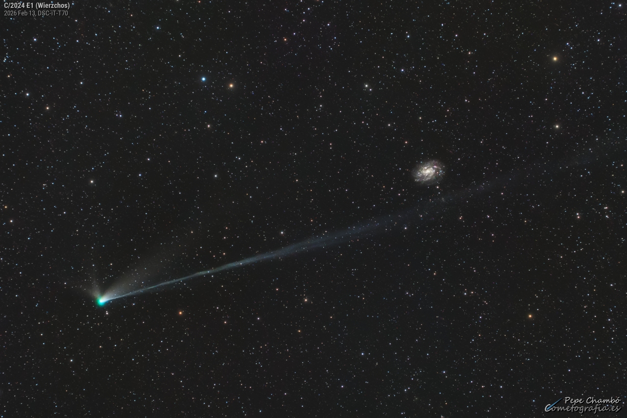 Some comets are regular guests of our solar neighborhood; others come by only once, never to return. We won’t have another chance to see Comet C/2024 E1 (Wierzchoś), which is currently making its way through the inner Solar System. The hyperbolic orbit of this comet indicates that it will likely become an interstellar traveler. Comet Wierzchoś is today near its closest approach to the Earth, passing roughly the same distance from the Earth as is the Sun. The featured 30-minute exposure was taken last week in Chile and shows a 5-degree long ion tail as well as three shorter dust tails. The green hue of the coma comes from the breakdown of dicarbon molecules by sunlight, but that process does not last long enough to also tinge the tails. On the far right lies a spiral galaxy far in the distance: NGC 300.