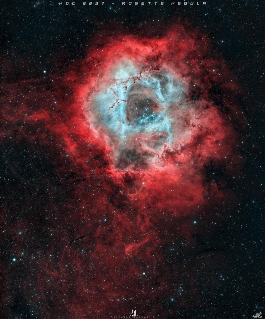 Roses are red, nebulas are too, and this Valentine's gift is a stunning view! Pictured is a loving look at the Rosette Nebula (NGC 2237): a cosmic bloom of bright young stars sitting atop a stem of glowing hot gas. The rose’s blue-white speckles are among the most luminous stars in the galaxy, with some burning millions of times brighter than the Sun. Their stellar winds sculpt the famed rose shape by pushing gas and dust away from the center. Though only a few million years old, these massive stars are already nearing the end of their lives, while dimmer stars embedded in the nebula will burn for billions of years to come. The vibrant red hue comes from hydrogen gas, ionized by the ultraviolet light from the young stars. The rose’s blue-white center is color-mapped to indicate the presence of similarly ionized oxygen. The Rosette Nebula reminds us of the beauty and transformation woven into the fabric of the universe.