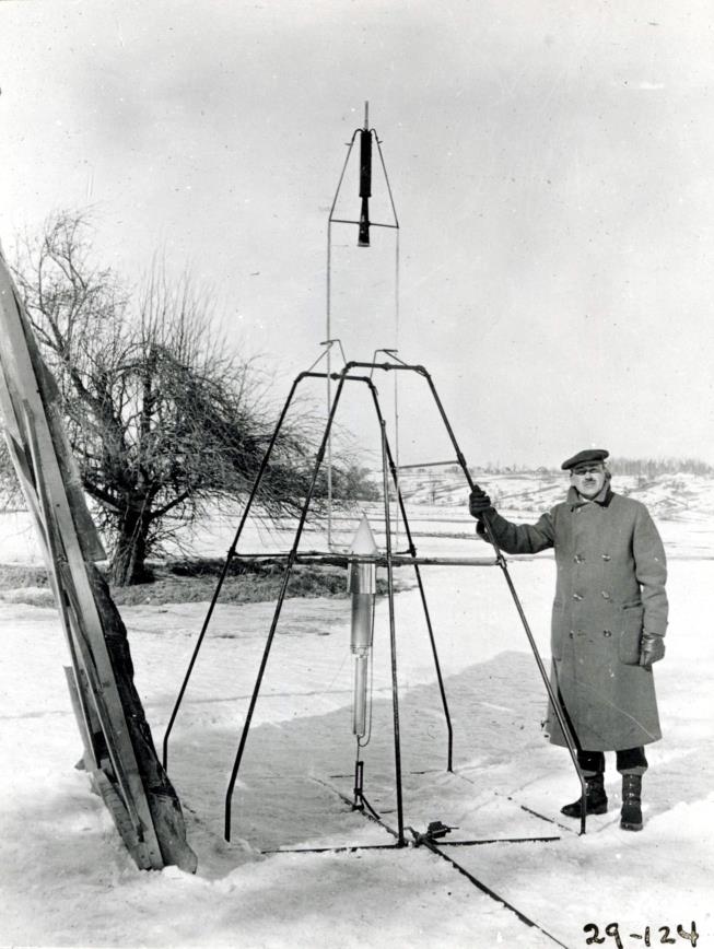 Goddard stands next to the 10 foot tall rocket, holding